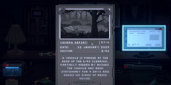 In the game you play a night shift park ranger who monitors camera footage and corrects/destroys/classifies camera footage in park and notices strange events starting to take place in the park.